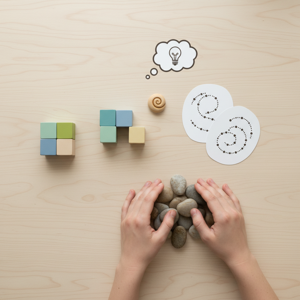 Dauguma vaikų (kaip ir suaugusiųjų) pasaulį puikiai priima per vaizdinę informaciją. Naudokite edukacines korteles. Vienoje kortelės pusėje aiškiai užrašykite veiksmą, kitoje – atsakymą. Dar geriau – leiskite vaikui pačiam tas korteles gaminti, piešti, spalvinti. Galite kiekvienam skaičiui priskirti tam tikrą išskirtinį personažą ar daiktą. Pavyzdžiui, skaičius 8 gali vizualiai priminti sniego senį, o skaičius 7 – stebuklingą burtų lazdelę ar lazdą. Sukurkite trumpą pasaką: kai burtų lazdelė (7) paliečia sniego senį (8), jie virsta 56 snaigėmis. Taip pat labai naudinga naudoti realius erdvinius objektus: „Lego“ kaladėles, žaislinius automobiliukus, makaronus ar sagas. Išdėliokite keturias eiles po tris kaladėles ir leiskite vaikui pačiam suskaičiuoti jas visas, padedant suprasti, kodėl atsakymas yra dvylika. Fizinis objektų lietimas ir matymas padeda smegenims geriau suvokti pačią daugybos prigimtį.